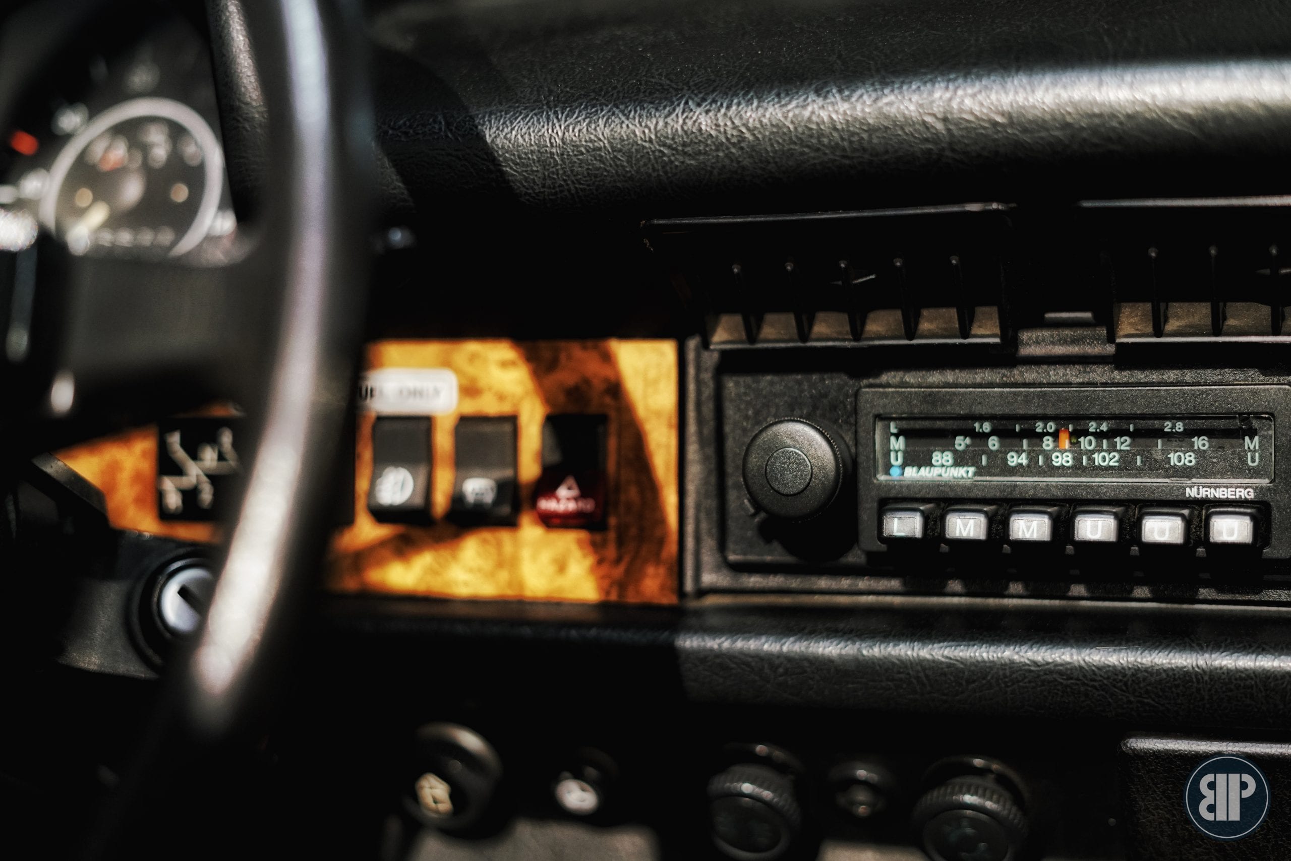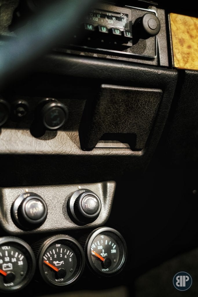 Inredningen är original så när som på dörrsidorna som blivit ersatta med nya. Bilen utrustades från fabrik med bla AC, radio, läderklädd ratt, träpanel, mittkonsol och katalysator. I motorluckan finns en extra ventilationslucka, gömd bakom registreringsbelysningen som hjälper till att få ut värmen i motorrummet